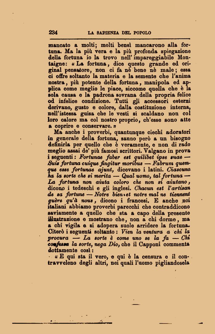 Ma anche i proverbi, quantunque ciechi adoratori in generale della fortuna, sanno però a un bisogno definirla per quello che è veramente, e non di rado meglio assai de' più famosi scrittori. Valgano in prova i seguenti : Fortunae faber est quilibet ipse suae — Suit fortuna cuique fingitur moribus — Fabrum quem-que esse fortunae ajunt, dicevano i latini. Ciascuno ha la sorte che si merita — Qual uomo, tal fortuna — La fortuna non aiuta coloro che non si aiutano, dicono i tedeschi e gli inglesi. Chacun est l'artisan de sa fortune — Notre biemet notre mal ne tiennent guère qu'à nous, dicono i francesi, E anche noi italiani abbiamo proverbi parecchi che contraddicono saviamente a quello che sta a capo della presente illustrazione e mostrano che, non a chi dorme, ma a chi vigila e si adopera suole arridere la fortuna» Citerò i seguenti soltanto : Vien la ventura a chi la procura — La sorte è come uno se la fa — Chi comfossa la sorte, nega Dio, che il Capponi commenta dottamente così :