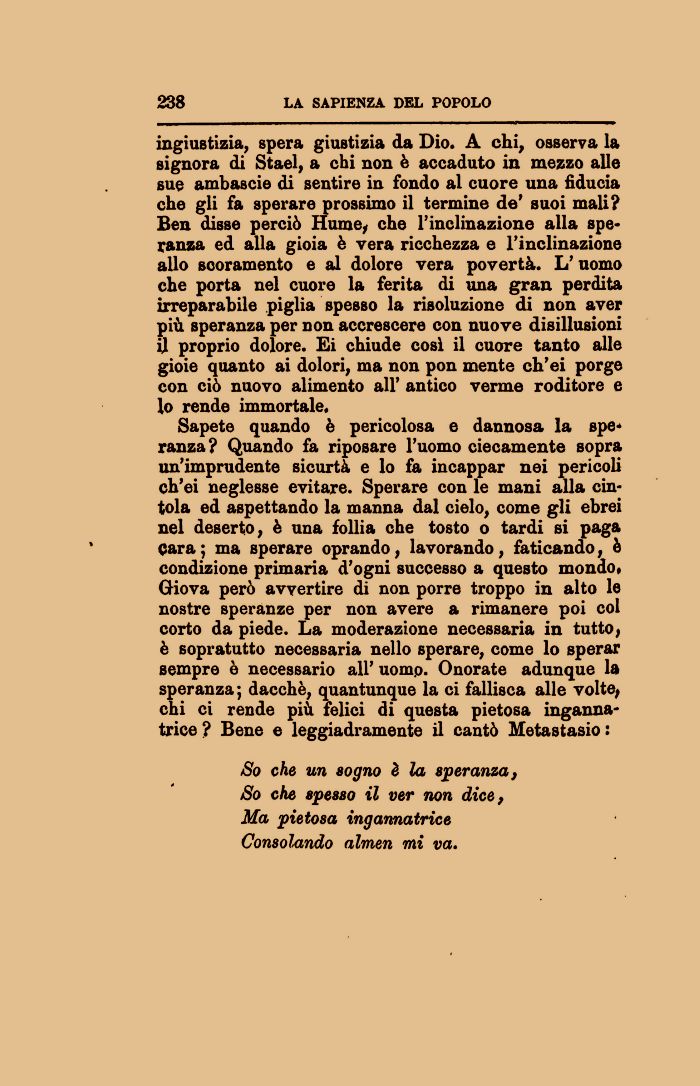 Sapete quando è pericolosa e dannosa la speranza ? Quando fa riposare l'uomo ciecamente sopra un'imprudente sicurtà e lo fa incappar nei pericoli ch'ei neglesse evitare. Sperare con le mani alla cintola ed aspettando la manna dal cielo, come gli ebrei nel deserto, è una follia che tosto o tardi si paga Cara ; ma sperare oprando , lavorando , faticando, è condizione primaria d'ogni successo a questo mondo. Giova però avvertire di non porre troppo in alto le nostre speranze per non avere a rimanere poi col corto da piede. La moderazione necessaria in tutto, è sopratutto necessaria nello sperare, come lo sperar sempre è necessario all' uomo. Onorate adunque la speranza ; dacché, quantunque la ci fallisca alle volte, chi ci rende più felici di questa pietosa ingannatrice ? Bene e leggiadramente il cantò Metastasio :