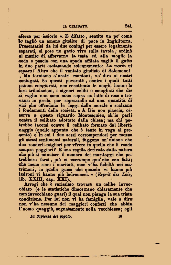 . Ma torniamo a' nostri montoni, vo' dire ai nostri coniugati. Se questi poveretti, contro i quali tutti paiono congiurati, non eccettuato le mogli, hanno le loro tribolazioni, i signori celibi o smogliati che dir si voglia non sono mica sopra un letto di rose e tro-vansi in preda per soprassello ad una quantità di vizi che offendono le leggi della morale e scalzano i fondamenti della società. « A Dio non piaccia, osserva a questo riguardo Montesquieu, ch'io parli contea il celibato adottato dalla chiesa; ma chi potrebbe tacersi contro il celibato formato dal libertinaggio (quello appunto che è tanto in voga al presente) e in cui i due sessi corrompendosi per mezzo gli stessi sentimenti naturali, fuggono un' unione che dee renderli migliori per vivere in quella che li rende sempre peggiori? E una regola derivata dalla natura numero dei maritaggi che po-