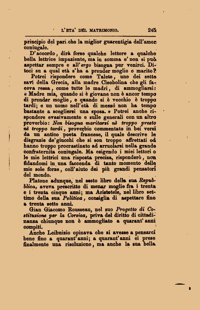 Platone adunque, nel sesto libro della sua Repubblica, aveva prescritto di menar moglie fra i trenta e i trenta cinque anni; ma Aristotele, nel libro settimo della sua Politica, consiglia di aspettare fino a trenta sette anni.