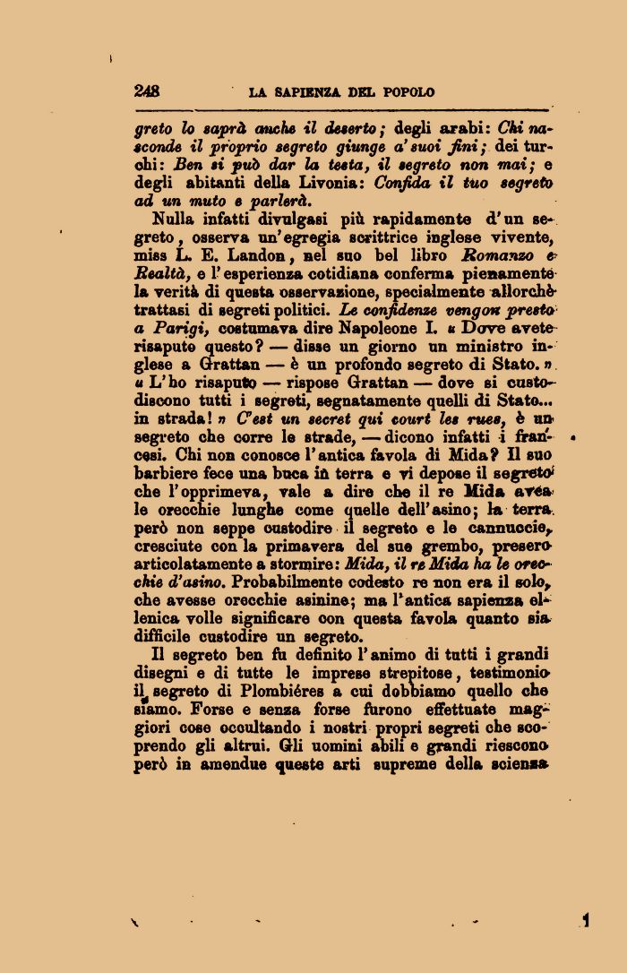 Nulla infatti divulgasi più rapidamente d'un segreto , osserva un' egregia scrittrice inglese vivente, miss L. E. Landon, nel suo bel libro Romanzo e Realtà, e l'esperienza cotidiana conferma pienamente la verità di questa osservazione, specialmente allorché-trattasi di segreti politici. Le confidenze vengon presta a Parigi, costumava dire Napoleone I. u Dove avete risaputo questo? — disse un giorno un ministro inglese a Grattan — è un profondo segreto di Stato, n u L'ho risaputo — rispose Grattan — dove si custodiscono tutti i segreti, segnatamente quelli di Stato... in strada !» C est un secret qui court les rues, è an segreto che corre le strade, — dicono infatti i fran- • cesi. Chi non conosce l'antica favola di Mida? Il suo barbiere fece una buca iù terra e vi depose il segreto' che l'opprimeva, vale a dire che il re Mida avea le orecchie lunghe come quelle dell'asino; la terra però non seppe custodire il segreto e le cannuccie, cresciute con la primavera del sue grembo, presero articolatamente a stormire: Mida, il re Mida ha le oreo-chie d'asino. Probabilmente codesto re non era il solo, che avesse orecchie asinine; ma l'antica sapienza ellenica volle significare con questa favola quanto sia difficile custodire un segreto.