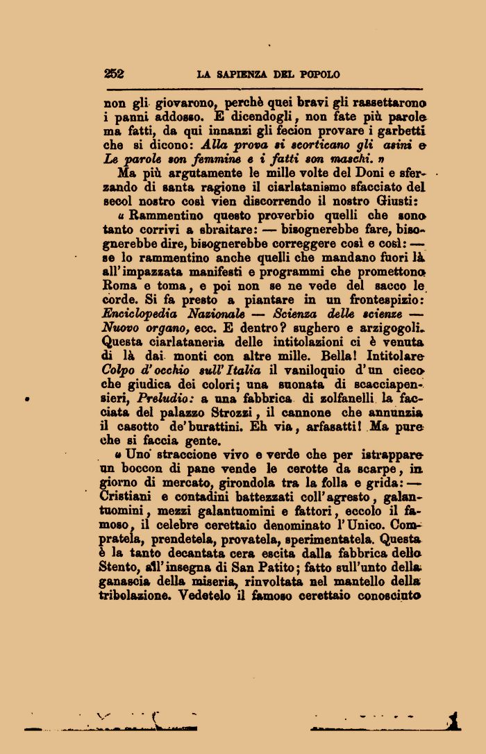Ma più argutamente le mille volte del Doni e sferzando di santa ragione il ciarlatanismo sfacciato del secol nostro cosi vien discorrendo il nostro Giusti: