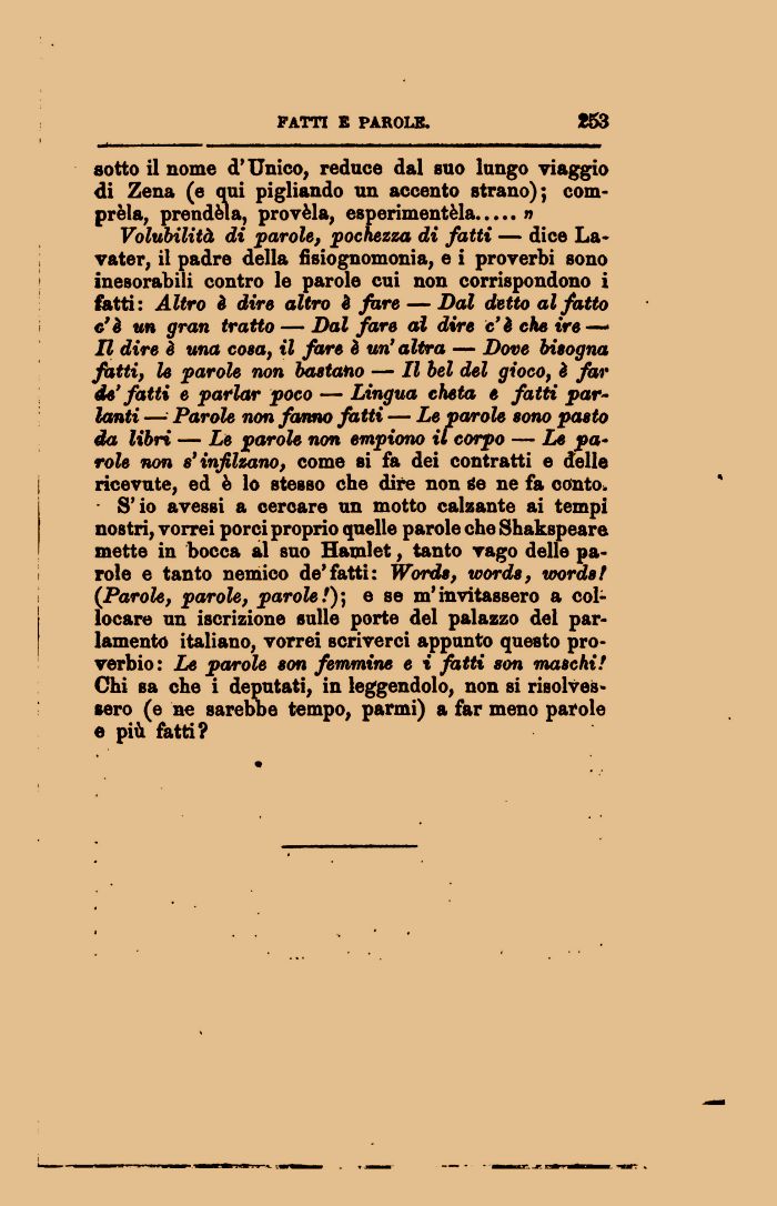 Volubilità di parole, pochezza di fatti — dice La-vater, il padre della fisiognomonia, e i proverbi sono inesorabili contro le parole cui non corrispondono i fatti: Altro è dire altro è fare — Dal detto al fatto c'è un gran tratto — Dal fare al dire c'è che ire — Il dire è una cosa, il fare è un' altra — Dove bisogna fatti, le parole non bastano — Il bel del gioco, è far de' fatti e parlar poco — Lingua cheta e fatti parlanti — Parole non fanno fatti — Le parole sono pasto da libri — Le parole non empiono il corpo — Le parole non s'infilzano, come si fa dei contratti e delle ricevute, ed è lo stesso che dire non Se ne fa conto* S'io avessi a cercare un motto calzante ai tempi nostri, vorrei porci proprio quelle parole che Shakspeare mette in bocca al suo Hamlet, tanto vago delle parole e tanto nemico de'fatti: Words, words, mordst {Parole, parole, parole!)] e se m'invitassero a collocare un iscrizione sulle porte del palazzo del parlamento italiano, vorrei scriverci appunto questo proverbio: Le parole son femmine e i fatti son maschi! Chi sa che i deputati, in leggendolo, non si risolvessero (e ne sarebbe tempo, parmi) a far meno parole e più fatti?