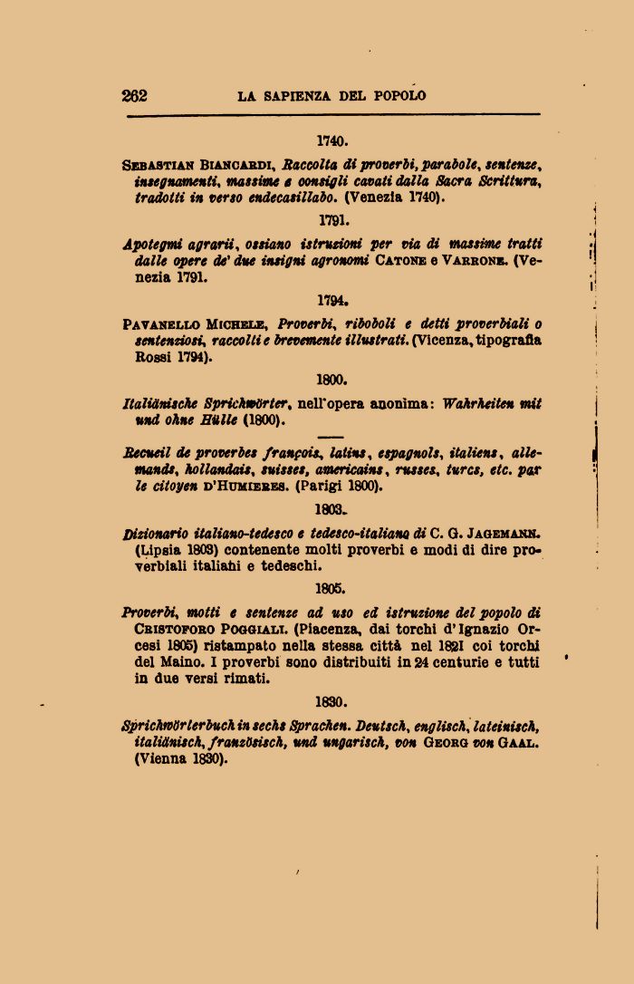 Proverbi, motti e sentenze ad uso ed istruzione del popolo di Cristoforo Poggiali. (Piacenza, dai torchi d'Ignazio Or-cesi 1805) ristampato nella stessa città nel 1821 coi torchi del Maino. I proverbi sono distribuiti in 24 centurie e tutti in due versi rimati.