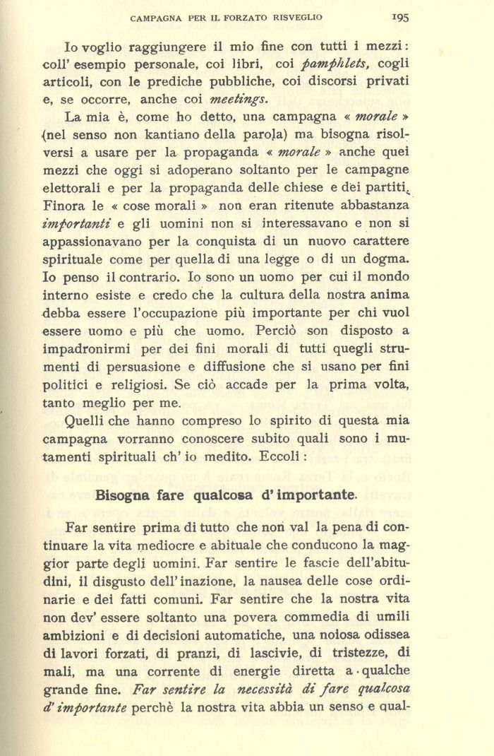 Far sentire prima di tutto che non vai la pena di continuare la vita mediocre e abituale che conducono la maggior parte degli uomini. Far sentire le fascie dell'abitudini, il disgusto dell' inazione, la nausea delle cose ordinarie e dei fatti comuni. Far sentire che la nostra vita non dev' essere soltanto una povera commedia di umili ambizioni e di decisioni automatiche, una noiosa odissea di lavori forzati, di pranzi, di lascivie, di tristezze, di mali, ma una corrente di energie diretta a • qualche grande fine. Far sentire la necessità di fare qualcosa d'importante perchè la nostra vita abbia un senso e qual-