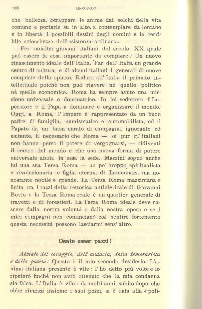Per noialtri giovani italiani del secolo XX quale può essere la cosa importante da compiere ? Un nuovo rinascimento ideale dell'Italia. 'Far dell' Italia un grande centro di cultura, e di alcuni italiani i generali di nuove conquiste dello spirito. Ridare all' Italia il primato intellettuale poiché non può riavere nè quello politico nè quello economico. Roma ha sempre avuto una missione universale e dominatrice. In lei sedettero l'Imperatore e il Papa a dominare e organizzare il mondo. Oggi, a Roma, l'Impero è rappresentato da un buon padre di famiglia, numismatico e automobilista, ed il Papato da un buon curato di campagna, ignorante ed esitante. E necessario che Roma — se pur gì' italiani non hanno perso il potere di vergognarsi, — ridiventi il centro del mondo e che una nuova forma di potere universale abbia in essa la sede. Mazzini sognò anche lui una sua Terza Roma — un po' troppo spiritualista e rivoluzionaria e figlia uterina di Lamennais, ma nonostante nobile e grande. La Terza Roma mazziniana è finita tra i razzi della rettorica anticlericale di Giovanni Bovio e la Terza Roma reale è un quartier generale di travetti e di forestieri. La Terza Roma ideale deve nascere dalla nostra volontà e dalla nostra opera e se .i miei compagni non cominciano col sentire fortemente questa necessità possono lasciarmi senz' altro.