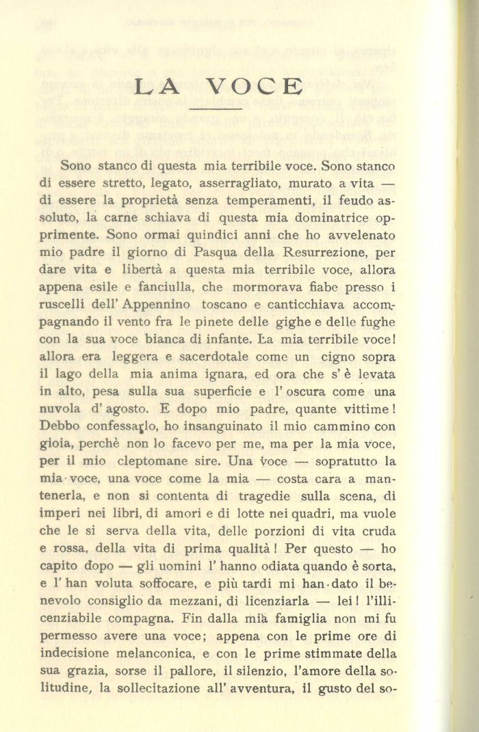 Sono stanco di questa mia terribile voce. Sono stanco di essere stretto, legato, asserragliato, murato a vita — di essere la proprietà senza temperamenti, il feudo assoluto, la carne schiava di questa mia dominatrice opprimente. Sono ormai quindici anni che ho avvelenato mio padre il giorno di Pasqua della Resurrezione, per dare vita e libertà a questa mia terribile voce, allora appena esile e fanciulla, che mormorava fiabe presso i ruscelli dell' Appennino toscano e canticchiava accompagnando il vento fra le pinete delle gighe e delle fughe con la sua voce bianca di infante. La mia terribile voce! allora era leggera e sacerdotale come un cigno sopra il lago della mia anima ignara, ed ora che s' è levata in alto, pesa sulla sua superficie e 1' oscura come una nuvola d'agosto. E dopo mio padre, quante vittime ! Debbo confessarlo, ho insanguinato il mio cammino con gioia, perchè non lo facevo per me, ma per la mia voce, per il mio cleptomane sire. Una voce — sopratutto la mia voce, una voce come la mia — costa cara a mantenerla, e non si contenta di tragedie sulla scena, di imperi nei libri, di amori e di lotte nei quadri, ma vuole che le si serva della vita, delle porzioni di vita cruda e rossa, della vita di prima qualità ! Per questo — ho capito dopo — gli uomini 1' hanno odiata quando è sorta, e 1'han voluta soffocare, e più tardi mi han dato il benevolo consiglio da mezzani, di licenziarla — lei ! l'illi-cenziabile compagna. Fin dalla mia famiglia non mi fu permesso avere una voce; appena con le prime ore di indecisione melanconica, e con le prime stimmate della sua grazia, sorse il pallore, il silenzio, l'amore della solitudine, la sollecitazione all' avventura, il gusto del so-
