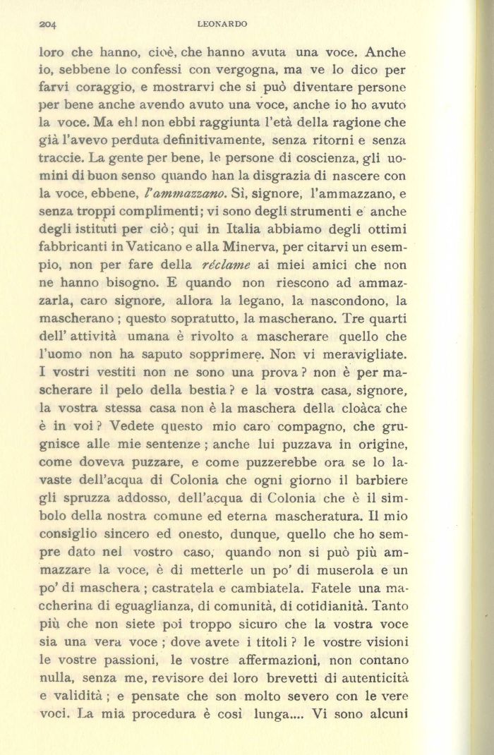 loro che hanno, cioè, che hanno avuta una voce. Anche io, sebbene lo confessi con vergogna, ma ve Io dico per farvi coraggio, e mostrarvi che si può diventare persone per bene anche avendo avuto una voce, anche io ho avuto la voce. Ma eh! non ebbi raggiunta l'età della ragione che già l'avevo perduta definitivamente, senza ritorni e senza traccie. La gente per bene, le persone di coscienza, gli uomini di buon senso quando han la disgrazia di nascere con la voce, ebbene, l'ammazzano. Si, signore, l'ammazzano, e senza troppi complimenti ; vi sono degli strumenti e anche degli istituti per ciò ; qui in Italia abbiamo degli ottimi fabbricanti in Vaticano e alla Minerva, per citarvi un esempio, non per fare della réclame ai miei amici che non ne hanno bisogno. E quando non riescono ad ammazzarla, caro signore, allora la legano, la nascondono, la mascherano ; questo sopratutto, la mascherano. Tre quarti dell' attività umana è rivolto a mascherare quello che l'uomo non ha saputo sopprimere. Non vi meravigliate. I vostri vestiti non ne sono una prova ? non è per mascherare il pelo della bestia ? e la vostra casa, signore, la vostra stessa casa non è la maschera della cloàca che è in voi ? Vedete questo mio caro compagno, che grugnisce alle mie sentenze ; anche lui puzzava in origine, come doveva puzzare, e come puzzerebbe ora se lo lavaste dell'acqua di Colonia che ogni giorno il barbiere gli spruzza addosso, dell'acqua di Colonia che è il simbolo della nostra comune ed eterna mascheratura. Il mio consiglio sincero ed onesto, dunque, quello che ho sempre dato nel vostro caso, quando non si può più ammazzare la voce, è di metterle un po' di muserola e un po' di maschera ; castratela e cambiatela. Fatele una ma-ccherina di eguaglianza, di comunità, di cotidianità. Tanto più che non siete poi troppo sicuro che la vostra voce sia una vera voce ; dove avete i titoli ? le vostre visioni le vostre passioni, le vostre affermazioni, non contano nulla, senza me, revisore dei loro brevetti di autenticità e validità ; e pensate che son molto severo con le vere voci. La mia procedura è così lunga.... Vi sono alcuni