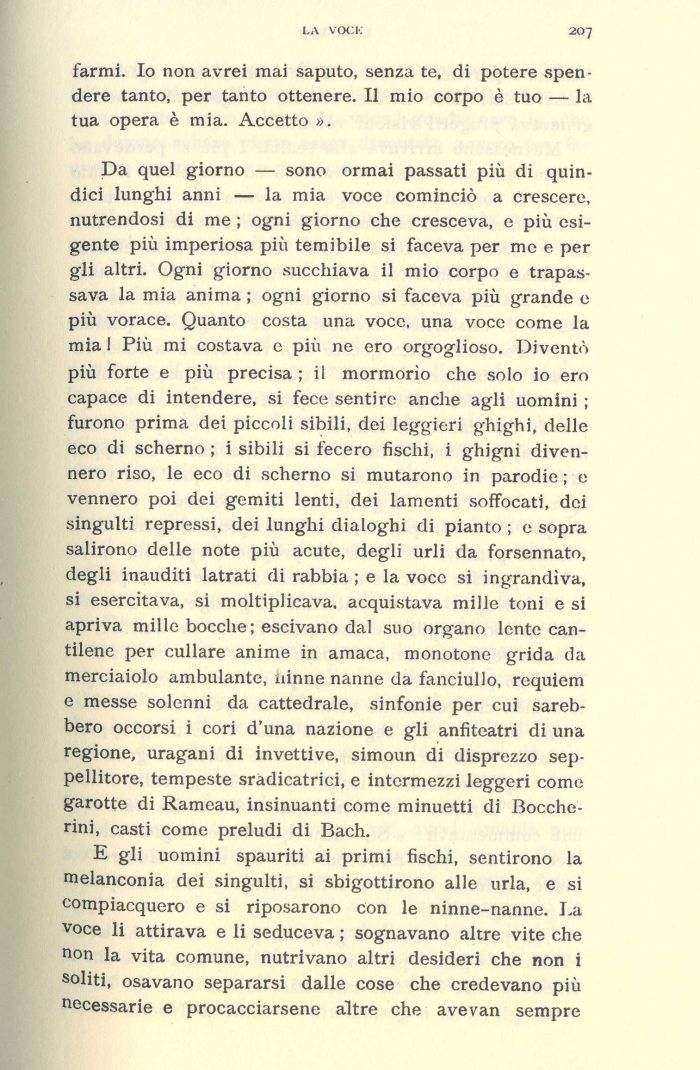 Da quel giorno — sono ormai passati più di quindici lunghi anni — la mia voce cominciò a crescere, nutrendosi di me ; ogni giorno che cresceva, e più esigente più imperiosa più temibile si faceva per me e per gli altri. Ogni giorno succhiava il mio corpo e trapassava la mia anima ; ogni giorno si faceva più grande e più vorace. Quanto costa una voce, una voce come la mia 1 Più mi costava e più ne ero orgoglioso. Diventò più forte e più precisa ; il mormorio che solo io ero capace di intendere, si fece sentire anche agli uomini ; furono prima dei piccoli sibili, dei leggieri ghighi, delle eco di scherno ; i sibili si fecero fischi, i ghigni divennero riso, le eco di scherno si mutarono in parodie ; e vennero poi dei gemiti lenti, dei lamenti soffocati, dei singulti repressi, dei lunghi dialoghi di pianto ; e sopra salirono delle note più acute, degli urli da forsennato, degli inauditi latrati di rabbia ; e la voce si ingrandiva, si esercitava, si moltiplicava, acquistava mille toni e si apriva mille bocche; escivano dal suo organo lente cantilene per cullare anime in amaca, monotone grida da merciaiolo ambulante, ninne nanne da fanciullo, requiem e messe solenni da cattedrale, sinfonie per cui sarebbero occorsi i cori d'una nazione e gli anfiteatri di una regione, uragani di invettive, simoun di disprezzo seppellitore, tempeste sradicatrici, e intermezzi leggeri come garotte di Rameau, insinuanti come minuetti di fìocche-rini, casti come preludi di Bach.