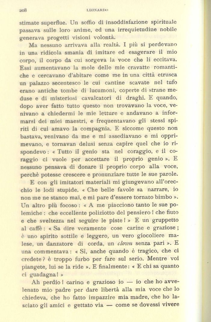 Ma nessuno arrivava alla realtà. I più si perdevano in una ridicola smania di imitare ed esagerare il mio corpo, il corpo da cui sorgeva la voce che li eccitava. Essi aumentavano la mole delle mie cravatte romantiche e cercavano d'abitare come me in una città etnisca un palazzo secentesco le cui cantine scavate nel tufo erano antiche tombe di lucumoni, coperte di strane meduse e di misteriosi cavalcatori di draghi. E quando, dopo aver fatto tutto questo non trovavano la voce, venivano a chiedermi le mie letture e andavano a informarsi dei miei maestri, e frequentavano gli stessi spiriti di cui amavo la compagnia. E siccome questo non bastava, venivano da me e mi assediavano e mi opprimevano, e tornavan delusi senza capire quel che io rispondevo : « Tutto il genio sta nel coraggio, e il coraggio ci vuole per accettare il proprio genio ». E nessuno pensava di donare il proprio corpo alla voce, perchè potesse crescere e pronunziare tutte le sue parole.