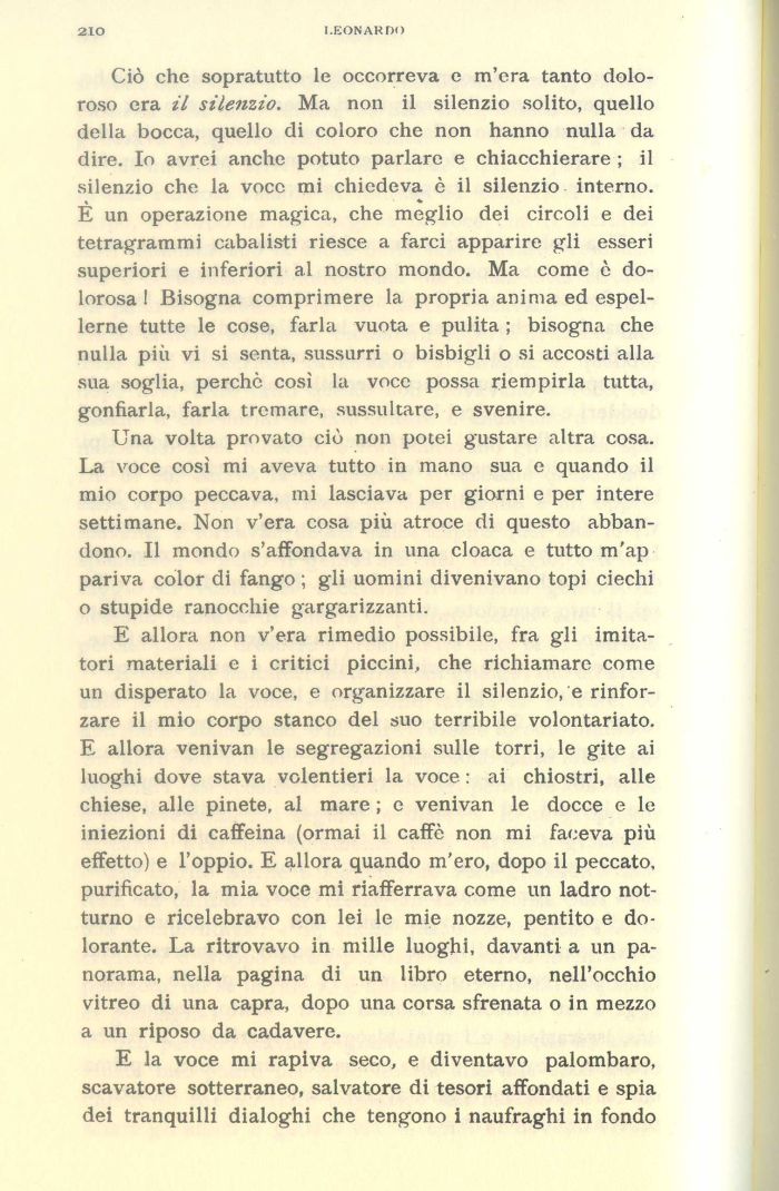 E allora non v'era rimedio possibile, fra gli imitatori materiali e i critici piccini, che richiamare come un disperato la voce, e organizzare il silenziose rinforzare il mio corpo stanco del suo terribile volontariato. E allora venivan le segregazioni sulle torri, le gite ai luoghi dove stava volentieri la voce : ai chiostri, alle chiese, alle pinete, al mare ; e venivan le docce e le iniezioni di caffeina (ormai il caffè non mi faceva più effetto) e l'oppio. E allora quando m'ero, dopo il peccato, purificato, la mia voce mi riafferrava come un ladro notturno e ricelebravo con lei le mie nozze, pentito e dolorante. La ritrovavo in mille luoghi, davanti a un panorama, nella pagina di un libro eterno, nell'occhio vitreo di una capra, dopo una corsa sfrenata o in mezzo a un riposo da cadavere.
