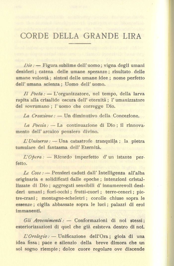 Le Cose : — Pensieri caduti dall' Intelligenza all'alba originaria e solidificati dalle epoche ; intenzioni cristallizzate di Dio ; aggregati sensibili d'innumerevoli desideri umani ; fiori-occhi ; frutti-cuori ; terre-ceneri ; pietre-crani ; montagne-scheletri ; corolle chiuse sopra le essenze ; ciglia abbassate sopra le luci ; palazzi di eroi immanenti.