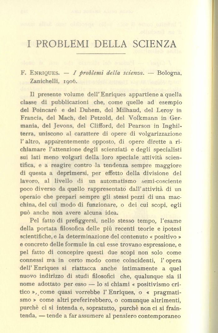 Il presente volume dell'Enriques appartiene a quella classe di pubblicazioni che, come quelle ad esempio del Poincaré e del Duhem, del Milhaud, del Leroy in Francia, del Mach, del Petzold, del Volkmann in Germania, del Jevons, del Clifford, del Pearson in Inghilterra, uniscono al carattere di opere di volgarizzazione l'altro, apparentemente opposto, di opere dirette a richiamare l'attenzione degli scienziati e degli specialisti sui lati meno volgari della loro speciale attività scientifica, e a reagire contro la tendenza sempre maggiore di questa a deprimersi, per effetto della divisione del lavoro, al livello di un automatismo semi-cosciente poco diverso da quello rappresentato dall' attività di un operaio che prepari sempre gli stessi pezzi di una macchina, del cui modo di funzionare, o dei cui scopi, egli può anche non avere alcuna idea.