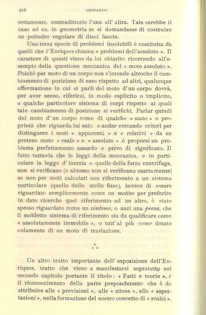 Una terza specie di problemi insolubili è costituita da quelli che l'Enriques chiama « problemi dell'assoluto ». Il carattere di questi viene da lui chiarito ricorrendo all'esempio della questione meccanica del « moto assoluto ». Poiché per moto di un corpo non s'intende altroché il cambiamento di posizione di esso rispetto ad altri, qualunque affermazione in cui si parli del moto d'un corpo dovrà, per aver senso, riferirsi, in modo esplicito o implicito, a qualche particolare sistema di corpi rispetto ai quali tale cambiamento di posizione si verifichi. Parlar quindi del moto d' un corpo come di qualche « stato » o proprietà che riguarda lui solo, o andar cercando criteri per distinguere i moti « apparenti » e « relativi » da un preteso moto « reale » e « assoluto » è proporsi un problema perfettamente assurdo e privo di significato. Il fatto tuttavia che le leggi della meccanica, e in particolare la legge d'inerzia e quelle della forza centrifuga, non si verificauo (o almeno non si verificano esattamente) se non per moti calcolati con riferimento a un sistema particolare (quello delle stelle fisse), invece di essere riguardato semplicemente come un motivo per preferire in date ricerche quel riferimento >ad un altro, è stato spesso riguardato come un sintomo, o anzi una prova, che il suddetto sistema di riferimento sia da qualificare come «assolutamente immobile», o tutt'al più come dotato