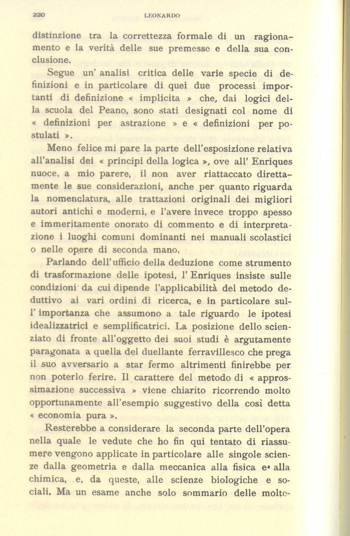 Meno felice mi pare la parte dell'esposizione relativa all'analisi dei « principi della logica », ove all' Enriques nuoce, a mio parere, il non aver riattaccato direttamente le sue considerazioni, anche per quanto riguarda la nomenclatura, alle trattazioni originali dei migliori autori antichi e moderni, e l'avere invece troppo spesso e immeritamente onorato di commento e di interpretazione i luoghi comuni dominanti nei manuali scolastici o nelle opere di seconda mano.