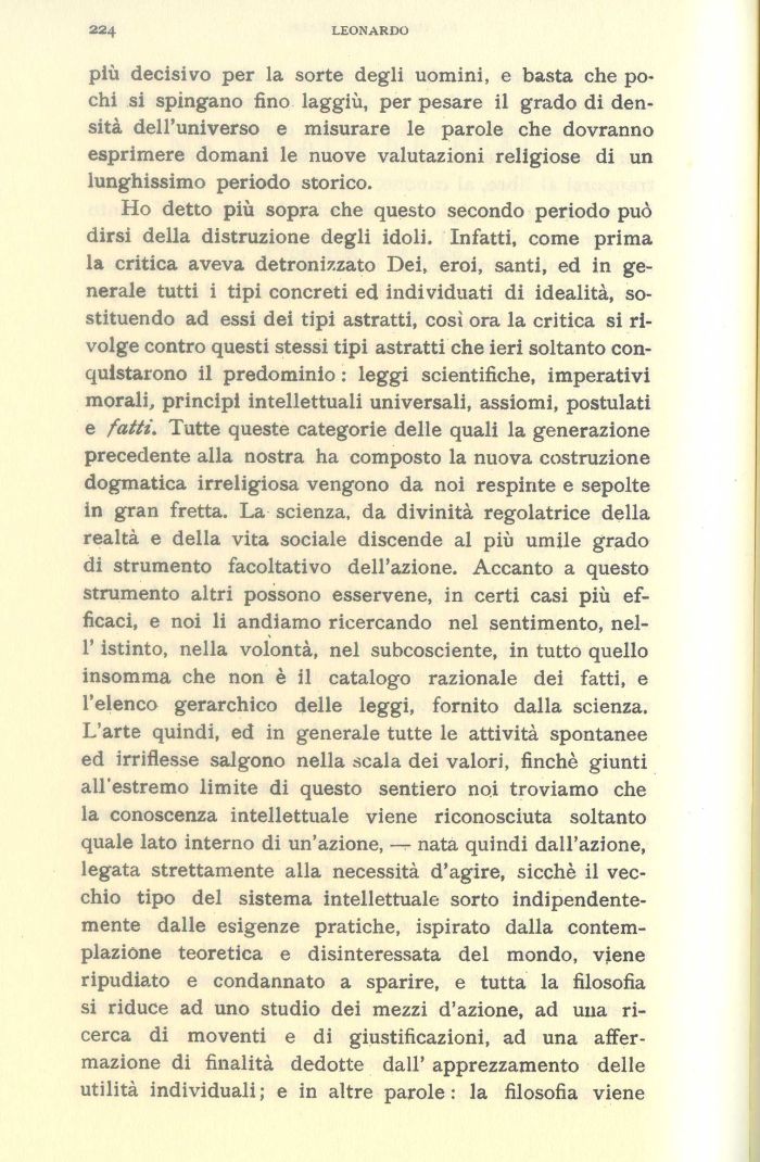 Ho detto più sopra che questo secondo periodo può dirsi della distruzione degli idoli. Infatti, come prima la critica aveva detronizzato Dei, eroi, santi, ed in generale tutti i tipi concreti ed individuati di idealità, sostituendo ad essi dei tipi astratti, così ora la critica si rivolge contro questi stessi tipi astratti che ieri soltanto conquistarono il predominio : leggi scientifiche, imperativi morali, principi intellettuali universali, assiomi, postulati e fatti. Tutte queste categorie delle quali la generazione precedente alla nostra ha composto la nuova costruzione dogmatica irreligiosa vengono da noi respinte e sepolte in gran fretta. La scienza, da divinità regolatrice della realtà e della vita sociale discende al più umile grado di strumento facoltativo dell'azione. Accanto a questo strumento altri possono esservene, in certi casi più efficaci, e noi li andiamo ricercando nel sentimento, nel-l'istinto, nella volontà, nel subcosciente, in tutto quello insomma che non è il catalogo razionale dei fatti, e l'elenco gerarchico delle leggi, fornito dalla scienza. L'arte quindi, ed in generale tutte le attività spontanee ed irriflesse salgono nella scala dei valori, finché giunti all'estremo limite di questo sentiero noi troviamo che la conoscenza intellettuale viene riconosciuta soltanto quale lato interno di un'azione, — nata quindi dall'azione, legata strettamente alla necessità d'agire, sicché il vecchio tipo del sistema intellettuale sorto indipendentemente dalle esigenze pratiche, ispirato dalla contemplazione teoretica e disinteressata del mondo, viene ripudiato e condannato a sparire, e tutta la filosofia si riduce ad uno studio dei mezzi d'azione, ad una ricerca di moventi e di giustificazioni, ad una affermazione di finalità dedotte dall' apprezzamento delle utilità individuali; e in altre parole: la filosofia viene