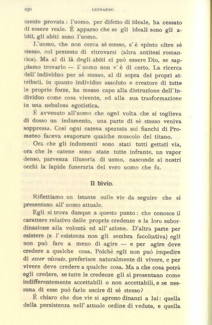 L'uomo, che non cerca sè stesso, s' è spinto oltre sè stesso, col pretesto di ritrovarsi (altra antitesi romantica). Ma al di là degli abiti ci può essere Dio, se sappiamo trovarlo — 1-' uomo non v' è di certo. La ricerca dell'individuo per sè stesso, al di sopra dei propri attributi, in quanto individuo assoluto e creatore di tutte le proprie forze, ha messo capo alla distruzione dell'individuo come cosa vivente, ed alla sua trasformazione in una nebulosa egotistica.