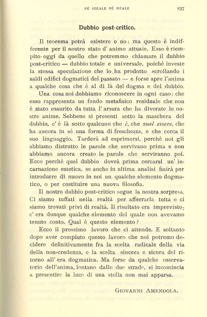 Il teorema potrà esistere o no : ma questo è indifferente per il nostro stato d' animo attuale. Esso è riempito- oggi da quello che potremmo chiamare il dubbio post-critico—dubbio totale e universale, poiché investe la stessa speculazione che lo^ha prodotto scrollando i saldi edifici dogmatici del passato — e forse apre l'anima a qualche cosa che è al di là del dogma e del dubbio.