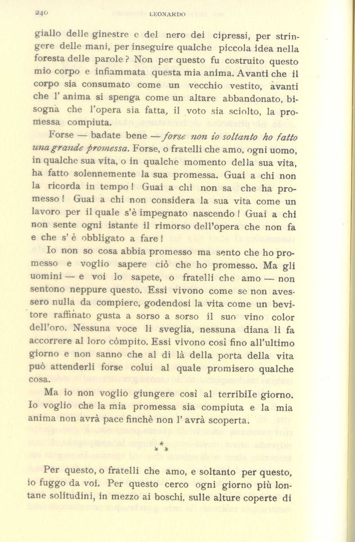 Forse — badate bene — forse non io soltanto ho fatto una grande promessa. Forse, o fratelli che amo, ogni uomo, in qualche sua vita, o in qualche momento della sua vita, ha fatto solennemente la sua promessa. Guai a chi non la ricorda in tempo ! Guai a chi non sa che ha promesso ! Guai a chi non considera la sua vita come un lavoro per il quale s'è impegnato nascendo ! Guai a chi non sente ogni istante il rimorso dell'opera che non fa e che s' è obbligato a fare !