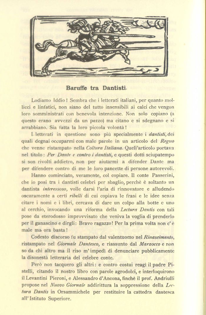 Hanno cominciato, veramente, col copiare. Il conte Passerini, che io posi tra i dantisti celebri per sbaglio, perchè è soltanto un dantista interessoso, volle darsi l'aria di rinnovatore e alludendo oscuramente a certi ribelli di cui copiava le frasi e le idee senza citare i nomi e i libri, cercava di dare un colpo alla botte e uno al cerchio, invocando una riforma della Lectura Dantis con tali pose da eterodosso improvvisato che veniva la voglia di prenderlo per il ganascino' e dirgli : Bravo ragazzo! Per la prima volta non c' è male ma ora basta !