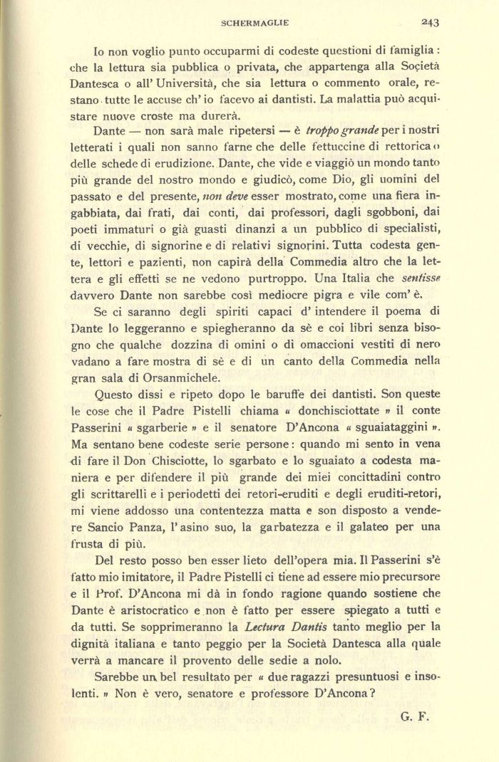 Questo dissi e ripeto dopo le baruffe dei dantisti. Son queste le cose che il Padre Pistelli chiama « donchisciottate » il conte Passerini « sgarberie » e il senatore D'Ancona « sguaiataggini ». Ma sentano bene codeste serie persone : quando mi sento in vena di fare il Don Chisciotte, lo sgarbato e lo sguaiato a codesta maniera e per difendere il più grande dei miei concittadini contro gli scrittarelli e i periodetti dei retori-eruditi e degli eruditi-retori, mi viene addosso una contentezza matta e son disposto a vendere Sancio Panza, l'asino suo, la garbatezza e il galateo per una frusta di più.