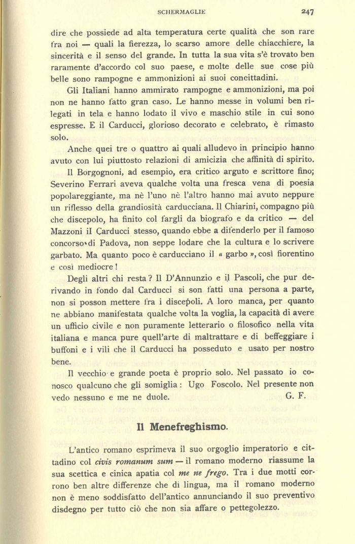Degli altri chi resta ? Il D'Annunzio e il Pascoli, che pur derivando in fondo dal Carducci si son fatti una persona a parte, non si posson mettere fra i discepoli. A loro manca, per quanto ne abbiano manifestata qualche volta la voglia, la capacità di avere un ufficio civile e non puramente letterario o filosofico nella vita italiana e manca pure quell'arte di maltrattare e di beffeggiare i buffoni e i vili che il Carducci ha posseduto e usato per nostro bene.