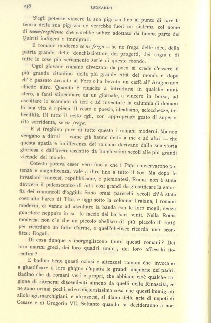 Ogni giovane romano divezzato da poco si crede d'essere il più grande cittadino della più grande città del mondo e dopo eh' è passato accanto al Foro o ha bevuto un caffè all' Aragno non chiede altro. Quando è riuscito a introdursi in qualche ministero, a farsi stipendiare da un giornale, a vincere in borsa, ad ascoltare lo scandalo di ieri e ad inventare la calunnia di domani la sua vita è ripiena. Il resto è poesia, idealismo, sciocchezze, imbecillità. Di tutto il resto egli, con appropriato gesto di superio rità sorridente, se ne frega.