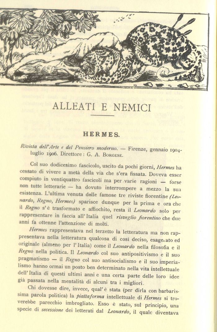 Hermes rappresentava nel terzetto la letteratura ma non rappresentava nella letteratura qualcosa di così deciso, esagei ato ed originale (almeno per l'Italia) come il Leonardo nella filosofia e il Regno nella politica. Il Leonardo col suo antipositivismo e il suo pragmatismo — il Regno col suo antisocialismo e il suo imperialismo hanno ormai un posto ben determinato nella vita intellettuale dell' Italia di questi ultimi anni e una certa parte delle loro idee già passata nella mentalità di alcuni tra i migliori.