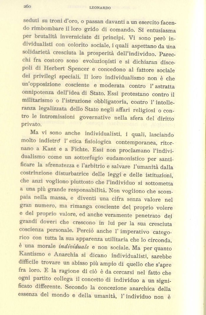 Ma vi sono anche individualisti, i quali, lasciando molto indietrcf 1' etica fisiologica contemporanea, ritornano a Kant e a Fichte. Essi non proclamano l'individualismo come un sotterfugio eudamonistico per santificare la sfrenatezza e l'arbitrio e salvare l'umanità dalla costrinzione disturbatrice delle leggi e delle istituzioni, che anzi vogliono piuttosto che l'individuo si sottometta a una più grande responsabilità. Non vogliono che scompaia nella massa, e diventi una cifra senza valore nel gran numero, ma rimanga cosciente del proprio volere e del proprio valore, ed anche veramente penetrato dei grandi doveri che crescono in lui per la sua cresciuta coscienza personale. Perciò anche 1' imperativo categorico con tutta la sua apparenza utilitaria che lo circonda, è una morale individuale e non sociale. Ma per quanto Kantismo e Anarchia si dicano individualisti, sarebbe difficile trovare un abisso più ampio di quello che s'apre fra loro. E la ragione di ciò è da cercarsi nel fatto che ogni partito collega il concetto di individuo a un significato differente. Secondo la concezione anarchica della essenza del mondo e della umanità, l' individuo non è