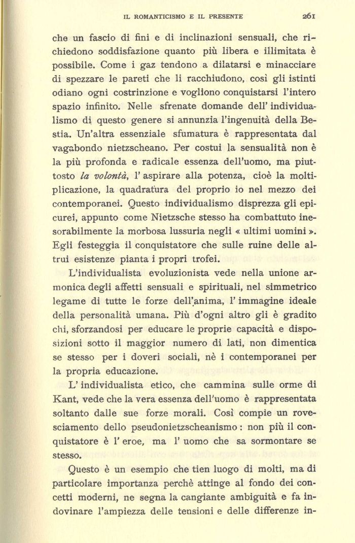 L'individualista etico, che cammina sulle orme di Kant, vede che la vera essenza dell'uomo è rappresentata soltanto dalle sue forze morali. Così compie un rovesciamento dello pseudonietzscheanismo : non più il conquistatore è 1' eroe, ma 1' uomo che sa sormontare se stesso.