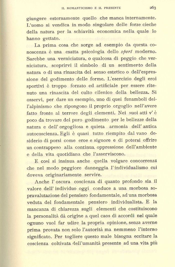 La prima cosa che sorge ad esempio da questa conoscenza è una esatta psicologia dello sport moderno. Sarebbe una verniciatura, o qualcosa di peggio che verniciatura, scoprirvi il simbolo di un sentimento della natura o di una rinascita del senso estetico o dell'espressione del godimento delle forme. L'esercizio degli eroi sportivi è troppo forzato ed artificiale per essere ritenuto una rinascita del culto ellenico della bellezza. Si osservi, per dare un esempio, uno di quei funamboli dell'alpinismo che ripongono il proprio orgoglio nell'avere fatto fronte al terrore degli elementi. Nei suoi atti v' è poco da trovare del puro godimento per le bellezze della natura e dell' orgogliosa e quieta armonia dell' antica autocoscienza. Egli è quasi tutto riempito dal vano desiderio di porsi come eroe e signore e di potersi offrire un contrappeso alla continua oppressione dell'ambiente e della vita quotidiana che l'asserviscono.