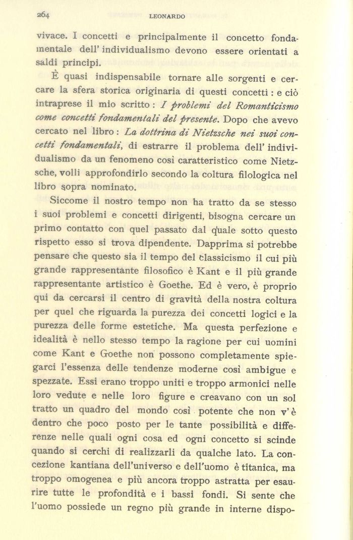 E quasi indispensabile tornare alle sorgenti e cercare la sfera storica originaria di questi concetti : e ciò intraprese il mio scritto : I problemi del Romanticismo come concetti fondamentali del presente. Dopo che avevo cercato nel libro : La dottrina di Nietzsche nei suoi concetti fondamentali, di estrarre il problema dell' individualismo da un fenomeno così caratteristico come Nietzsche, volli approfondirlo secondo la coltura filologica nel libro sopra nominato.