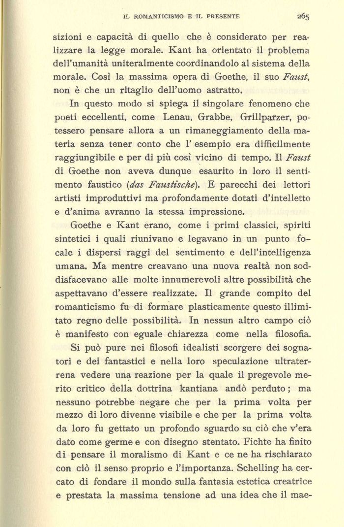 In questo modo si spiega il singolare fenomeno che poeti eccellenti, come Lenau, Grabbe, Grillparzer, potessero pensare allora a un rimaneggiamento della materia senza tener conto che 1' esempio era difficilmente raggiungibile e per di più così vicino di tempo. Il Faust di Goethe non aveva dunque esaurito in loro il sentimento faustico (das Faustisché). E parecchi dei lettori artisti improduttivi ma profondamente dotati d'intelletto e d'anima avranno la stessa impressione.