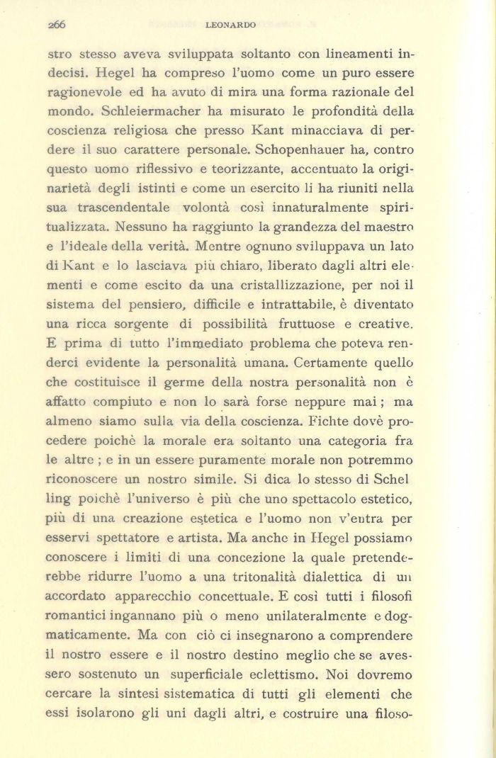 stro stesso aveva sviluppata soltanto con lineamenti indecisi. Hegel ha compreso l'uomo come un puro essere ragionevole ed ha avuto di mira una forma razionale del mondo. Schleiermacher ha misurato le profondità della coscienza religiosa che presso Kant minacciava di perdere il suo carattere personale. Schopenhauer ha, contro questo uomo riflessivo e teorizzante, accentuato la origi-narietà degli istinti e come un esercito li ha riuniti nella sua trascendentale volontà così innaturalmente spiritualizzata. Nessuno ha raggiunto la grandezza del maestro e l'ideale della verità. Mentre ognuno sviluppava un lato di Kant e lo lasciava più chiaro, liberato dagli altri elementi e come escito da una cristallizzazione, per noi il sistema del pensiero, difficile e intrattabile, è diventato una ricca sorgente di possibilità fruttuose e creative. E prima di tutto l'immediato problema che poteva renderci evidente la personalità umana. Certamente quello che costituisce il germe della nostra personalità non è affatto compiuto e non lo sarà forse neppure mai ; ma almeno siamo sulla via della coscienza. Fichte dovè procedere poiché la morale era soltanto una categoria fra le altre ; e in un essere puramente morale non potremmo riconoscere un nostro simile. Si dica lo stesso di Schei ling poiché l'universo è più che uno spettacolo estetico, più di una creazione estetica e l'uomo non v'entra per esservi spettatore e artista. Ma anche in Hegel possiamo conoscere i limiti di una concezione la quale pretenderebbe ridurre l'uomo a una tritonalità dialettica di un accordato apparecchio concettuale. E così tutti i filosofi romantici ingannano più o meno unilateralmente e dogmaticamente. Ma con ciò ci insegnarono a comprendere il nostro essere e il nostro destino meglio che se avessero sostenuto un superficiale eclettismo. Noi dovremo cercare la sintesi sistematica di tutti gli elementi che essi isolarono gli uni dagli altri, e costruire una filoso-