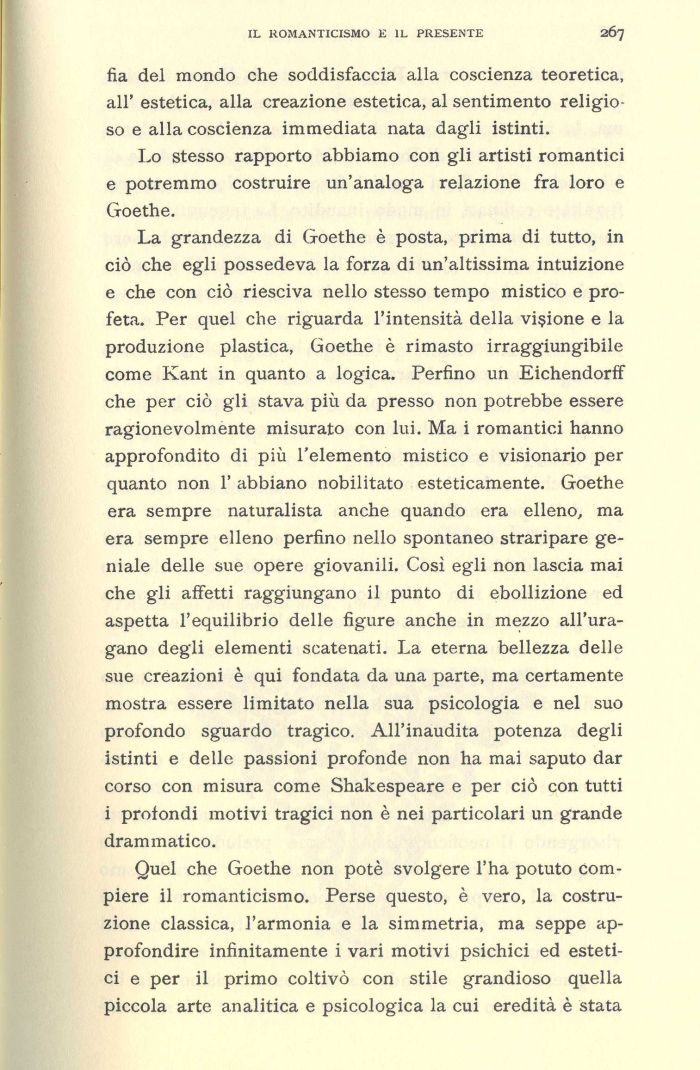 La grandezza di Goethe è posta, prima di tutto, in ciò che egli possedeva la forza di un'altissima intuizione e che con ciò riesciva nello stesso tempo mistico e profeta. Per quel che riguarda l'intensità della visione e la produzione plastica, Goethe è rimasto irraggiungibile come Kant in quanto a logica. Perfino un Eichendorff che per ciò gli stava più da presso non potrebbe essere ragionevolmente misurato con lui. Ma i romantici hanno approfondito di più l'elemento mistico e visionario per quanto non 1' abbiano nobilitato esteticamente. Goethe era sempre naturalista anche quando era elleno, ma era sempre elleno perfino nello spontaneo straripare geniale delle sue opere giovanili. Così egli non lascia mai che gli affetti raggiungano il punto di ebollizione ed aspetta l'equilibrio delle figure anche in mezzo all'uragano degli elementi scatenati. La eterna bellezza delle sue creazioni è qui fondata da una parte, ma certamente mostra essere limitato nella sua psicologia e nel suo profondo sguardo tragico. All'inaudita potenza degli istinti e delle passioni profonde non ha mai saputo dar corso con misura come Shakespeare e per ciò con tutti i profondi motivi tragici non è nei particolari un grande drammatico.