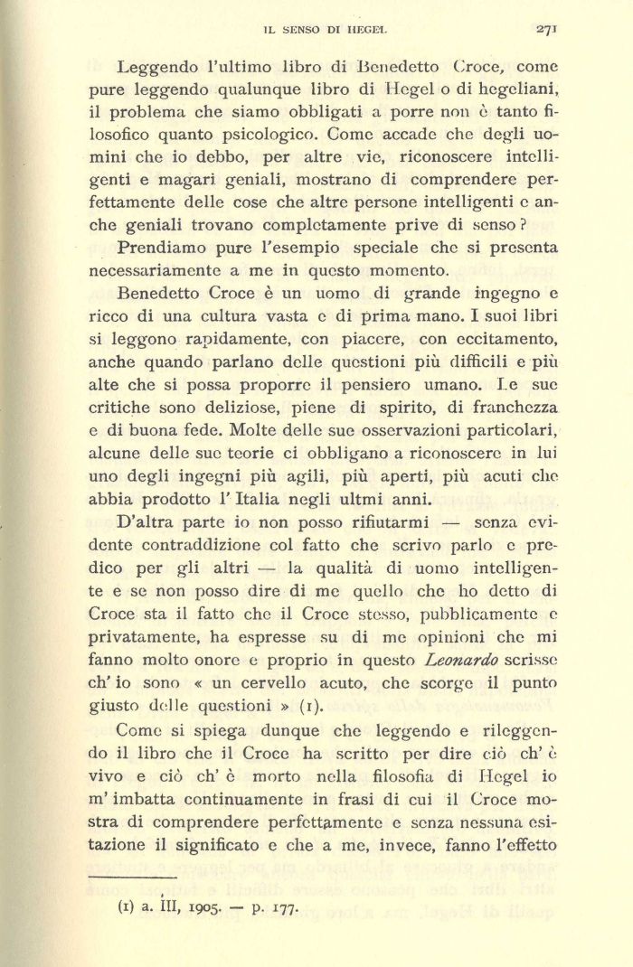 D'altra parte io non posso rifiutarmi — senza evidente contraddizione col fatto che scrivo parlo e predico per gli altri — la qualità di uomo intelligente e se non posso dire di me quello che ho detto di Croce sta il fatto che il Croce stesso, pubblicamente e privatamente, ha espresse su di me opinioni che mi fanno molto onore e proprio in questo Leonardo scrisse eh' io sono « un cervello acuto, che scorge il punto giusto delle questioni » (i).