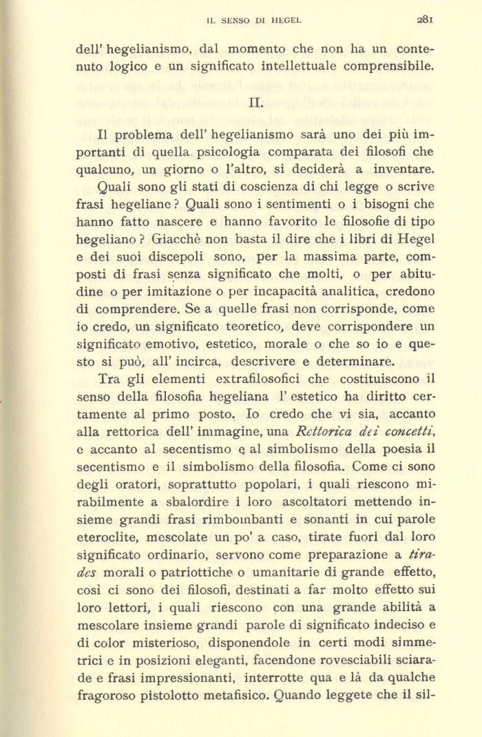 Quali sono gli stati di coscienza di chi legge o scrive frasi hegeliane ? Quali sono i sentimenti o i bisogni che hanno fatto nascere e hanno favorito le filosofie di tipo hegeliano ? Giacché non basta il dire che i libri di Hegel e dei suoi discepoli sono, per la massima parte, composti di frasi senza significato che molti, o per abitudine o per imitazione o per incapacità analitica, credono di comprendere. Se a quelle frasi non corrisponde, come io credo, un significato teoretico, deve corrispondere un significato emotivo, estetico, morale o che so io e questo si può, all' incirca, descrivere e determinare.