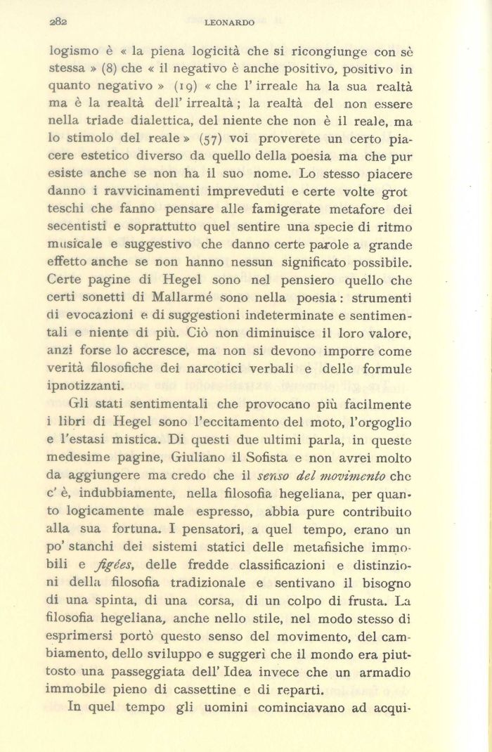 Gli stati sentimentali che provocano più facilmente i libri di Hegel sono l'eccitamento del moto, l'orgoglio e l'estasi mistica. Di questi due ultimi parla, in queste medesime pagine, Giuliano il Sofista e non avrei molto da aggiungere ma credo che il senso del movimento che c' è, indubbiamente, nella filosofia hegeliana, per quanto logicamente male espresso, abbia pure contribuito alla sua fortuna. I pensatori, a quel tempo, erano un po' stanchi dei sistemi statici delle metafisiche immobili e figées, delle fredde classificazioni e distinzioni della filosofia tradizionale e sentivano il bisogno di una spinta, di una corsa, di un colpo di frusta. La filosofia hegeliana, anche nello stile, nel modo stesso di esprimersi portò questo senso del movimento, del cam biamento, dello sviluppo e suggerì che il mondo era piuttosto una passeggiata dell' Idea invece che un armadio immobile pieno di cassettine e di reparti.