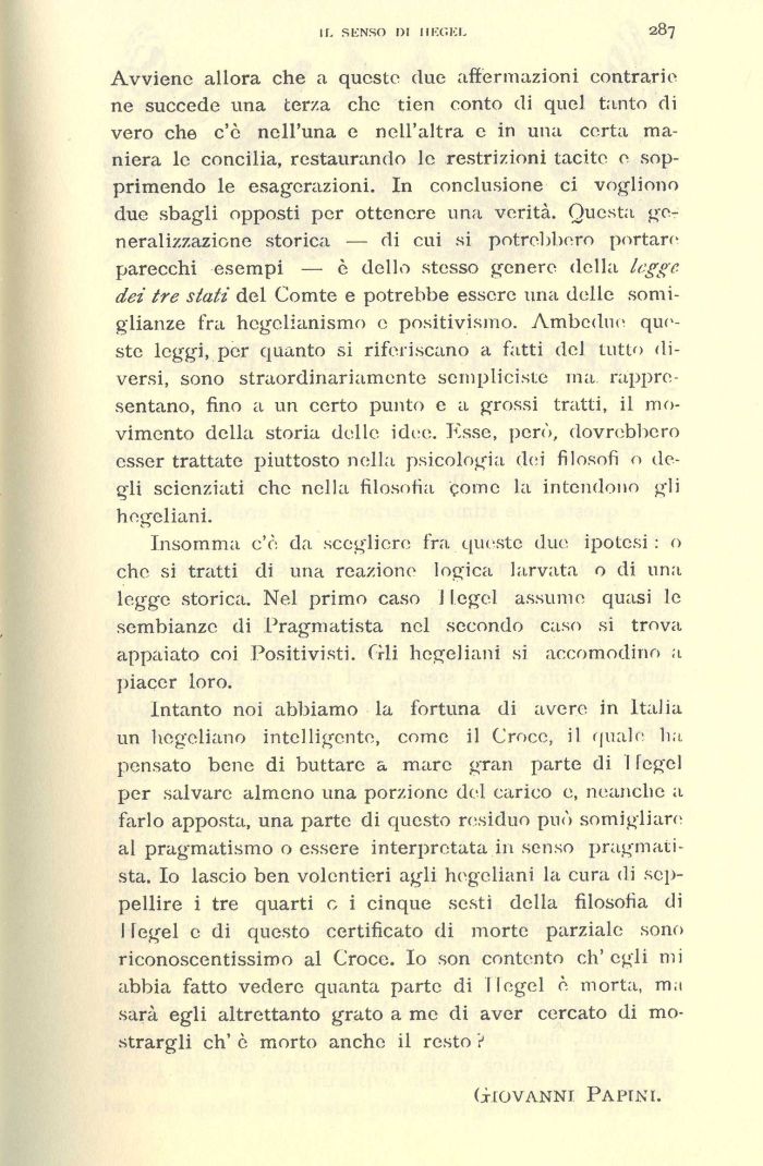 Insomma c'è da scegliere fra queste due ipotesi : o che si tratti di una reazione logica larvata o di una legge storica. Nel primo caso 1 legel assume quasi le sembianze di Pragmatista nel secondo caso si trova appaiato coi Positivisti. Gli hegeliani si accomodino a piacer loro.