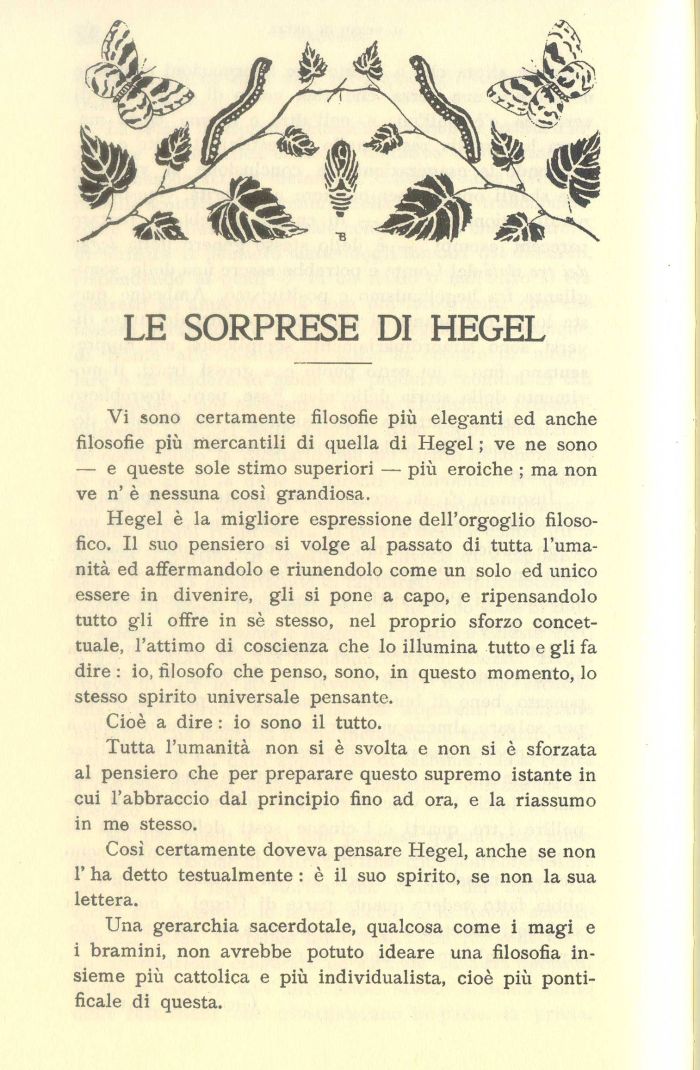Hegel è la migliore espressione dell'orgoglio filosofico. Il suo pensiero si volge al passato di tutta l'umanità ed affermandolo e riunendolo come un solo ed unico essere in divenire, gli si pone a capo, e ripensandolo tutto gli offre in sè stesso, nel proprio sforzo concettuale, l'attimo di coscienza che lo illumina tutto e gli fa dire : io, filosofo che penso, sono, in questo momento, lo stesso spirito universale pensante.