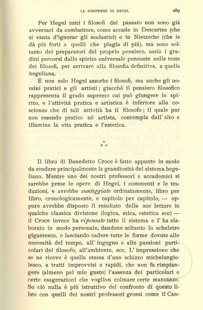 Il libro di Benedetto Croce è fatto appunto in modo da rendere principalmente la grandiosità del sistema hegeliano. Mentre uno dei nostri professori e accademici si sarebbe prese le opere di Hegel, i commenti e le traduzioni, e avrebbe sunteggiato ordinatamente, libro per libro, cronologicamente, e capitolo per capitolo, — oppure avrebbe disposto il resultato delle sue letture in qualche classica divisione (logica, etica, estetica ecc) — il Croce invece ha ripensato tutto il sistema e 1' ha elaborato in modo personale, dandone soltanto lo scheletro gigantesco, e lasciando cadere tutte le forme dovute alle necessità del tempo, all' ingegno e alle passioni particolari del filosofo, all'ambiente, ecc. L'impressione che se ne riceve è quella stessa d'uno schizzo michelangiolesco, a tratti improvvisi e rapidi, che non fa rimpiangere (almeno pel mio gusto) l'assenza dei particolari e certe esagerazioni che voglion colmare certe mancanze. Su ciò nulla è più istruttivo del confronto di questo libro con quelli dei nostri professori grossi come il Can-