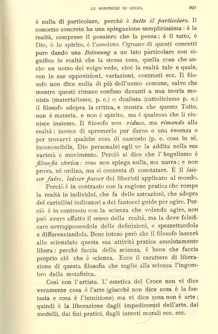 è nulla di particolare, perchè è tutto il particolare. Il concetto concreto ha una spiegazione semplicissima : è la realtà, compreso il pensiero che la pensa ; è il tutto, è Dio, ò lo spirito, e l'assoluto. Ognuno di questi concetti pure dando una Betonung a un lato particolare non significa in realtà che la stessa cosa, quella cosa che anche un uomo del volgo vede, cioè la realtà tale e quale, con le sue opposizioni, variazioni, contrasti ecc. Il filosofo non dice nulla di più dell'uomo comune, salvo che mentre questi rimane confuso davanti a una teoria monista (materialismo, p. e.) o dualista (cattolicismo p. e.) il filosofo adopra la critica, e mostra che questo Tutto, non è materia, e non è spirito, ma è qualcosa che li riunisce insieme. Il filosofo non riduce, ma rimanda alla realtà ; invece di spremerla per darne o una essenza o per trovarvi qualche cosa di nascosto (p. e. cosa in sè, inconoscibile. Dio personale) egli ve la addita nella sua varietà e movimento. Perciò si dice che 1' hegelismo è filosofia storica: essa non spiega nulla, ma narra; e non prova, nè ordina, ma si contenta di constatare. E il lais-ser fairc, laisscr passer dei liberisti applicato al mondo.