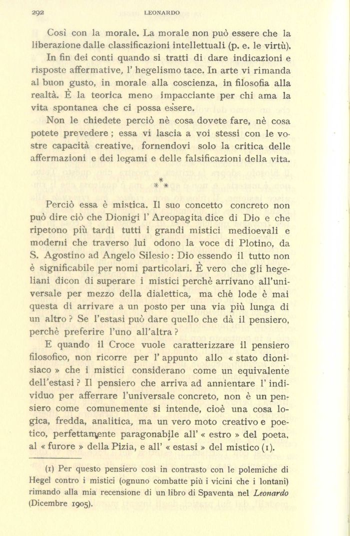 (i) Per questo pensiero così in contrasto con le polemiche di Hegel contro i mistici (ognuno combatte più i vicini che i lontani) rimando alla mia recensione di un libro di Spaventa nel Leonardo (Dicembre 1905).