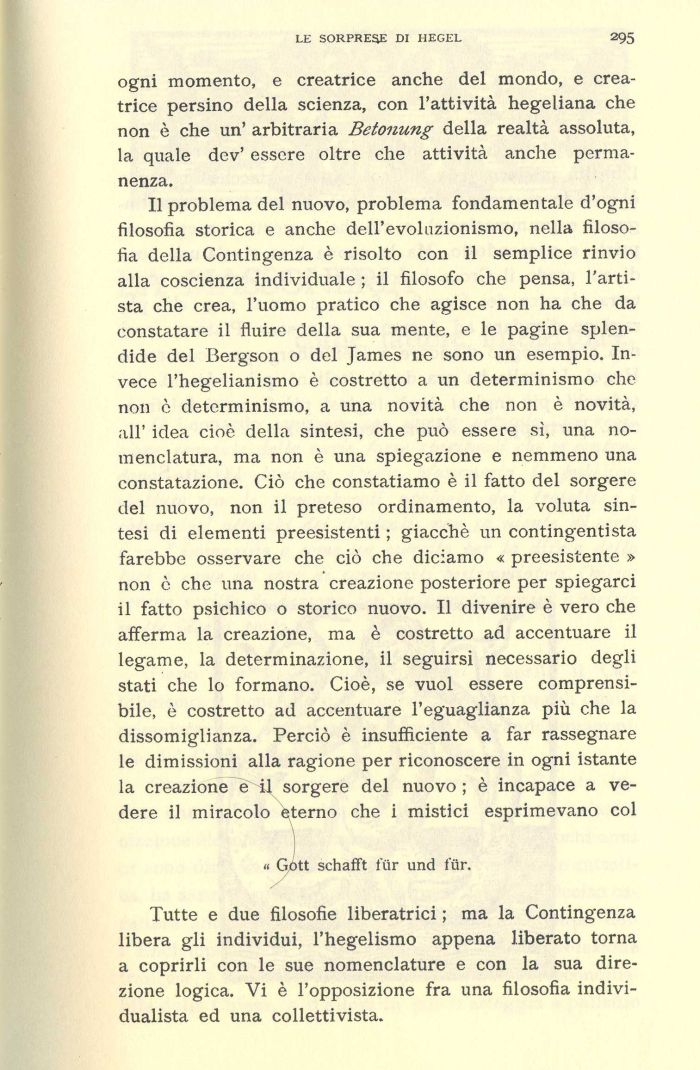 Tutte e due filosofie liberatrici ; ma la Contingenza libera gli individui, l'hegelismo appena liberato torna a coprirli con le sue nomenclature e con la sua direzione logica. Vi è l'opposizione fra una filosofìa individualista ed una collettivista.