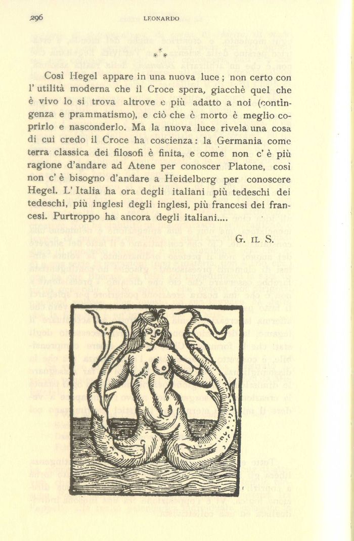 Così Hegel appare in una nuova luce ; non certo con 1' utilità moderna che il Croce spera, giacché quel che è vivo lo si trova altrove e più adatto a noi (contingenza e prammatismo), e ciò che è morto è meglio coprirlo e nasconderlo. Ma la nuova luce rivela una cosa di cui credo il Croce ha coscienza : la Germania come terra classica dei filosofi è finita, e come non c' è più ragione d'andare ad Atene per conoscer Platone, così non c' è bisogno d'andare a Heidelberg per conoscere Hegel. L' Italia ha ora degli italiani più tedeschi dei tedeschi, più inglesi degli inglesi, più francesi dei francesi. Purtroppo ha ancora degli italiani....