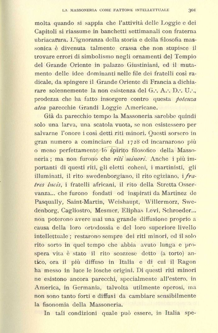 Già da parecchio tempo la Massoneria sarebbe quindi solo una larva, una scatola vuota, se non esistessero per salvarne l'onore i così detti riti minori. Questi sorsero in gran numero a cominciare dal 1728 ed incarnarono più o meno perfettamente/lo spirito filosofico della Massoneria ; ma non furono che riti minori. Anche i più importanti di questi riti, gli eletti coheni, i martinisti, gli illuminati, il rito swedenborgiano, il rito egiziano, i fra-tres Ihcìs, i fratelli africani, il rito della Stretta Osservanza... che furono fondati od inspirati da Martinez de Pasqually, Saint-Martin, Wcishaupt, Willermorz, Swe-denborg, Cagliostro, Mesmer, Eliphas Levi, Schroeder... non poterono avere mai una grande diffusione proprio a causa della loro ortodossia e del loro supcriore livello intellettuale; restarono sempre dei riti minori, ed il solo rito sorto in quel tempo che abbia avuto lunga e prospera vita è stato il rito scozzese detto (a torto) antico, ora il più diffuso in Italia e di cui il Ragon ha messo in luce le losche origini. Di questi riti minori ne esistono ancora parecchi, specialmente all'estero, in America, in Germania, talvolta utilmente operosi, ma non sono tanto forti e diffusi da cambiare sensibilmente la fisonomia della Massoneria.
