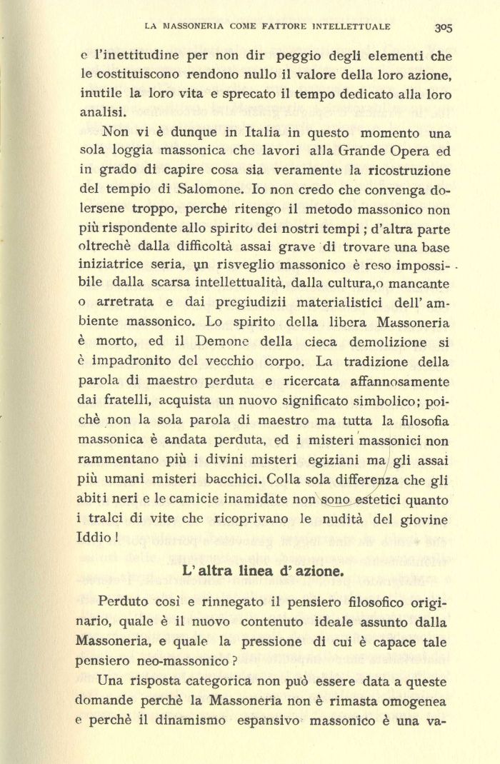 Non vi è dunque in Italia in questo momento una sola loggia massonica che lavori alla Grande Opera ed in grado di capire cosa sia veramente la ricostruzione del tempio di Salomone. Io non credo che convenga dolersene troppo, perché ritengo il metodo massonico non più rispondente allo spirito dei nostri tempi ; d'altra parte oltreché dalla difficoltà assai grave di trovare una base iniziatrice seria, yn risveglio massonico è reso impossibile dalla scarsa intellettualità, dalla cultura,o mancante