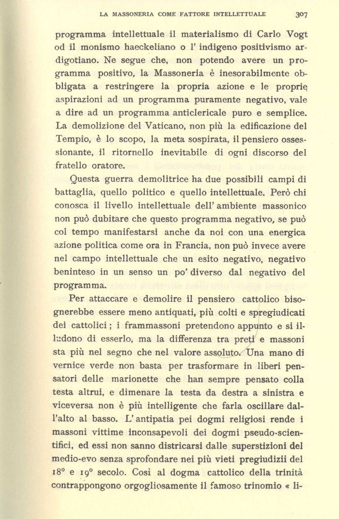 Questa guerra demolitrice ha due possibili campi di battaglia, quello politico e quello intellettuale. Però chi conosca il livello intellettuale dell' ambiente massonico non può dubitare che questo programma negativo, se può col tempo manifestarsi anche da noi con una energica azione politica come ora in Francia, non può invece avere nel campo intellettuale che un esito negativo, negativo beninteso in un senso un po' diverso dal negativo del programma.