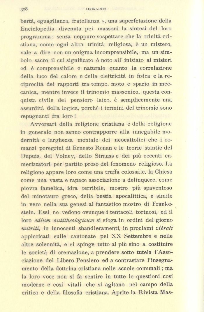 Avversari della religione cristiana e della religione in generale non sanno contrapporre alla innegabile modernità e larghezza mentale dei neocattolici che i romanzi peregrini di Ernesto Renan e le teorie stantie del Dupuis, del Volney, dello Strauss e dei più recenti eu-merizzatori per partito preso del fenomeno religioso. La religione appare loro come una truffa colossale, la Chiesa come una vasta e rapace associazione a delinquere, come piovra famelica, idra terribile, mostro più spaventoso del minotauro greco, della bestia apocalittica, e simile in vero nella sua genesi al fantastico mostro di Franke-stein. Essi ne vedono ovunque i tentacoli tortuosi, ed il loro odium antitheologicum si sfoga in ordini del giorno nutriti, in innocenti sbandieramenti, in proclami vibrati appiccicati sulle cantonate pel XX Settembre e nelle altre solennità, e si spinge tutto al più sino a costituire le società di cremazione, a prendere sotto tutela l'Associazione del Libero Pensiero ed a contrastare l'insegnamento della dottrina cristiana nelle scuole comunali ; ma la loro voce non si fa sentire in tutte le questioni così moderne e così vitali che si agitano nel campo della critica e della filosofia cristiana. Aprite la Rivista Mas-