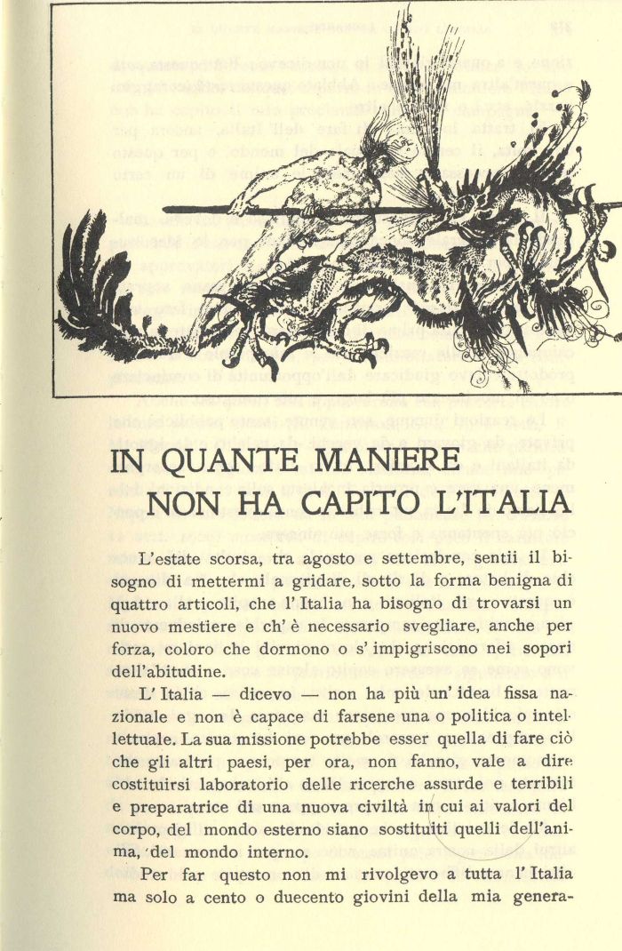 L'Italia — dicevo — non ha più un' idea fissa nazionale e non è capace di farsene una o politica o intellettuale. La sua missione potrebbe esser quella di fare ciò che gli altri paesi, per ora, non fanno, vale a dire costituirsi laboratorio delle ricerche assurde e terribili e preparatrice di una nuova civiltà in cui ai valori del corpo, del mondo esterno siano sostituiti quelli dell'anima, del mondo interno.